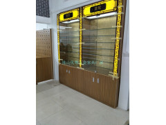 瓶柜,即摆放贮药瓶的药柜,高约60厘米,左右前后宽度与斗柜相等,座放于斗柜之上,与斗柜构成一整体,表面装有透明玻璃的开门,内设自下而上阶梯状两层平台,台上摆放药瓶,台内隔开,构成暗柜,前面为暗柜掀门,门上加有暗锁,门下设有一透气缝隙。其特点是瓶柜摆放药瓶整洁而醒目、暗柜放置药相对安全且取药便。